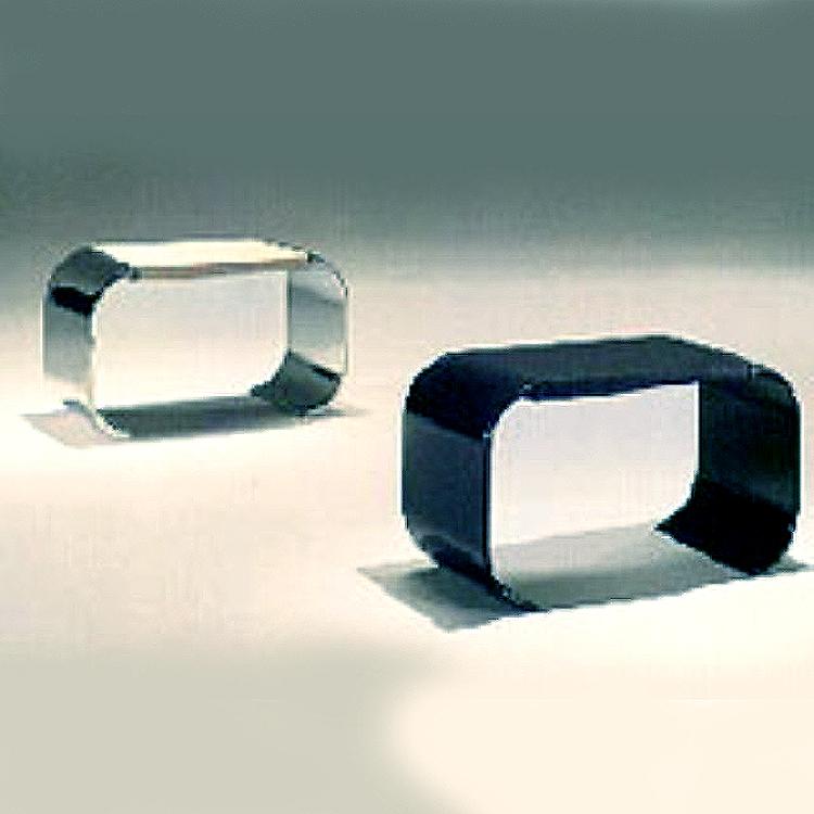 Macao table features curved metal planes connected by concealed stretchers with inset flush stone top.