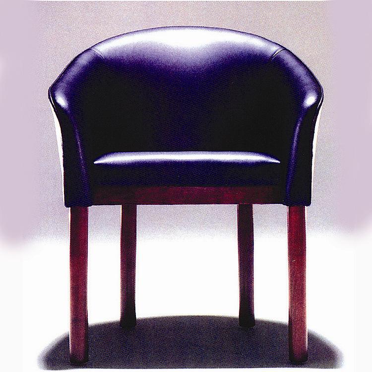 Subtle flowing lines define this lightweight, stretcherless pull-up chair. The upholstered seat, arms and back rest gracefully on wood legs with matching front facia.